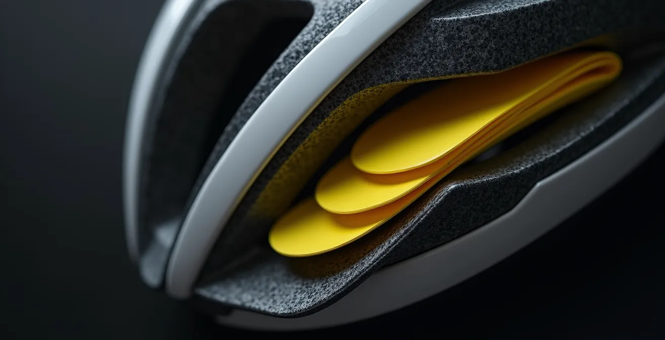 Les solutions classiques se concentrent sur l’absorption de l’énergie d’un choc linéaire, comme si la tête tombait parfaitement à la verticale sur le sol. Or, la réalité d’un accident est presque toujours un impact angulaire, générant des forces de rotation dévastatrices. C’est ici que la discussion doit changer de perspective. Si la véritable clé n’était pas seulement d’empêcher le crâne de se briser, mais d’imiter le propre mécanisme de protection du cerveau pour minimiser ce cisaillement interne ? La technologie MIPS (Multi-directional Impact Protection System) a été conçue précisément pour répondre à cette question, non pas comme un simple ajout marketing, mais comme une intervention biomécanique ciblée.